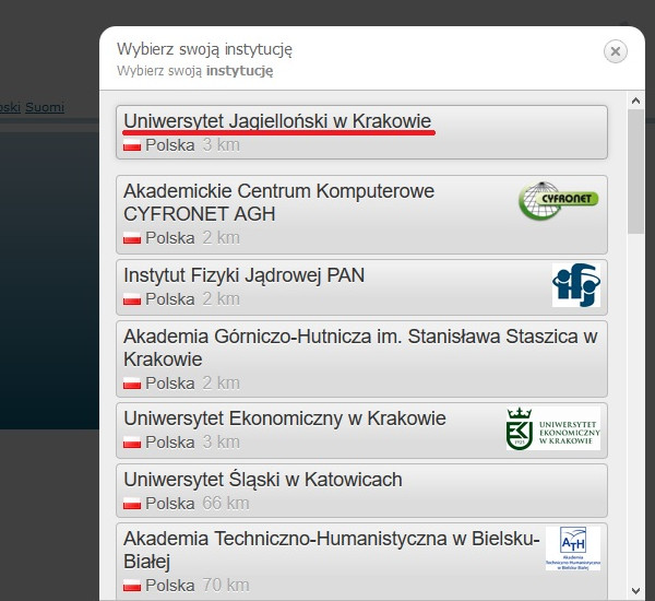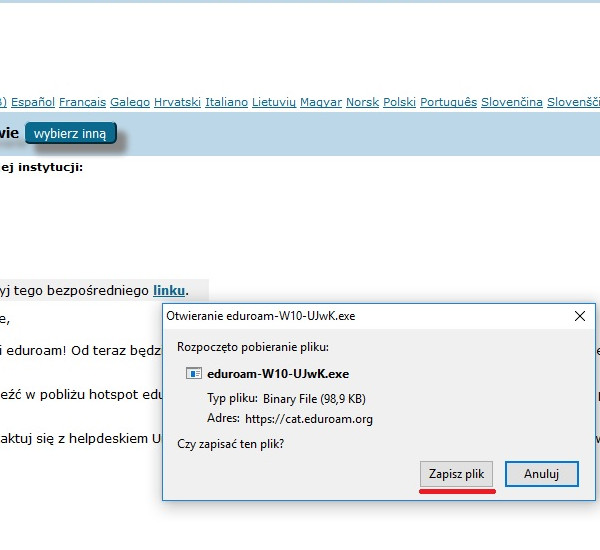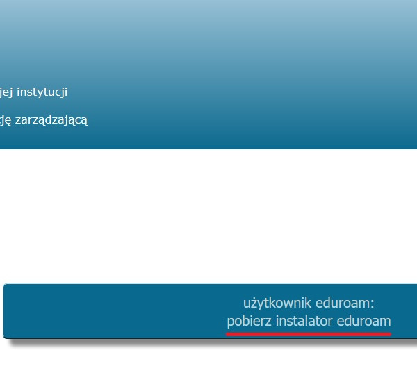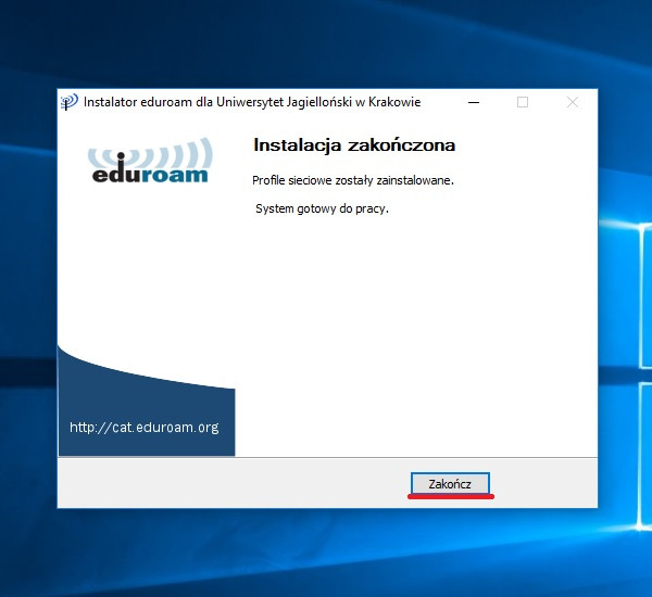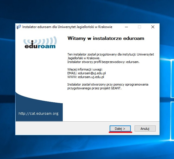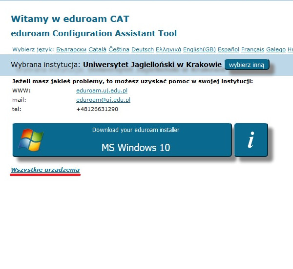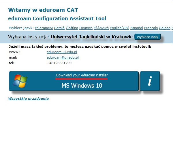 Na stronie internetowej https://cat.eduroam.org/ należy kliknąć przycisk użytkownik eduroam: pobierz instalator eduroam . Pojawi się okno z wyborem instytucji do której należymy i posiadamy konto w odpowiedniej domenie (uj.edu.pl) - w naszym przypadku wybieramy Uniwersytet Jagielloński w Krakowie . Powinien pojawić się link do instalatora z wersją naszego systemu operacyjnego, klikamy go.