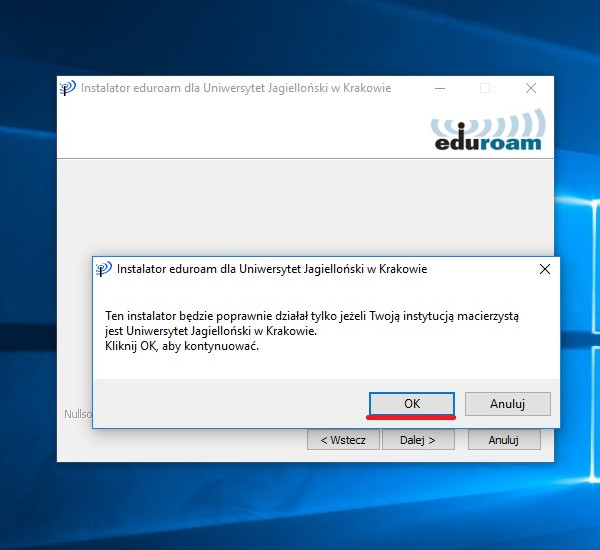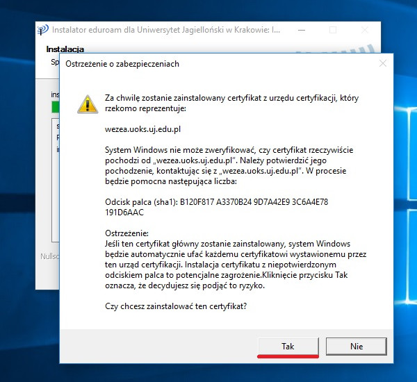 Otwieramy wcześniej pobrany plik, pojawi się powitalne okno instalatora . Zapoznajemy się z informacjami zawartymi w oknie i klikamy przycisk Dalej. Po naciśnięciu pojawi się informacja o macierzystej uczelni - w naszym przypadku powinna wyświetlić się informacja, że macierzystą uczelnią jest Uniwersytet Jagielloński w Krakowie. Klikamy przycisk OK. Następuje instalacja oprogramowania. Podczas instalacji pojawi się okno Ostrzeżenie o zabezpieczeniach . Aby zainstalować odpowiedni certyfikat klikamy przycisk Tak. Po poprawnej instalacji wybieramy Zakończ .