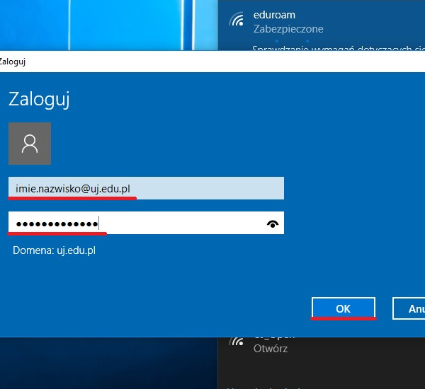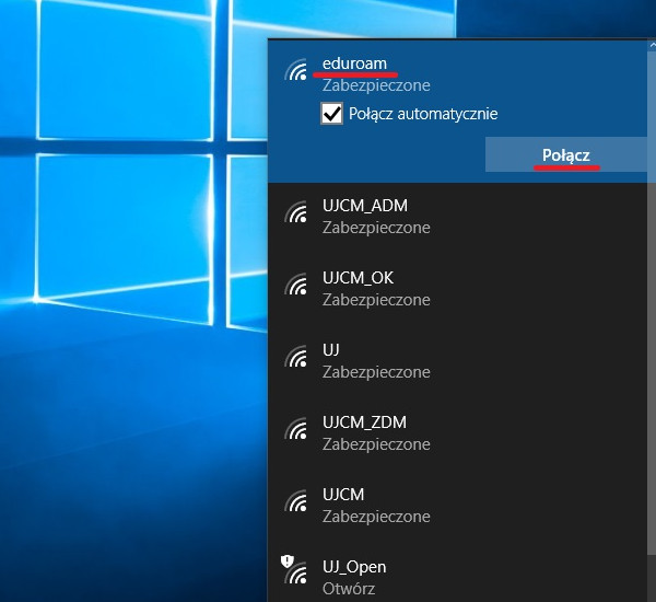 Po zakończonej instalacji, klikamy ikonkę sieci bezprzewodowej (zwykle znajduje się obok zegarka na pasku zadań). Wybieramy z dostępnych sieci Eduroam i klikamy Połącz . Wyświetla się okno logowania , w którym uzupełniamy nazwę konta i hasło (np.: imie.nazwisko@uj.edu.pl).