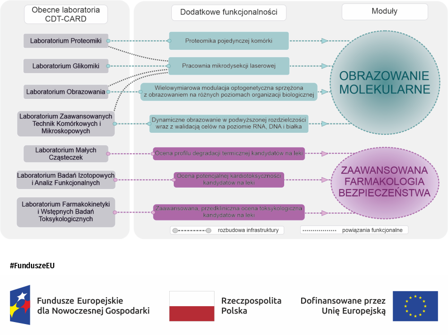 Finansowanie uzyskane w ramach konkursu pozwoli na zakup nowoczesnego sprzętu, a co za tym idzie – powstanie nowych modułów badawczych (schemat poniżej) rozszerzających dotychczasowe możliwości CDT-CARD m. in.: pracowni mikrodysekcji laserowej (umożliwiającej implementację technik tzw. obrazowania przestrzennego ang. spatial omics); modułu proteomiki pojedynczej komórki (tzw. Single-Cell Proteomics (SCP) opartego o nowy ultraczuły spektrometr masowy), modułu dynamicznego obrazowania w podwyższonej rozdzielczości wraz z walidacją celów molekularnych na poziomie RNA, DNA i białka z analizą ruchów komórek w układach mikroprzepływowych, a także modułu kompleksowego badania interakcji leków z kluczowymi kanałami jonowymi (system QPatch Compact).