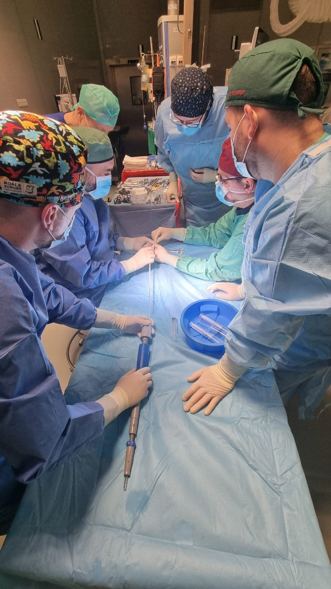 Zakończony sukcesem zabieg przeprowadził zespół w składzie: dr Marek Piwowarczyk, dr Andrzej Kostka, lek. Marcin Kołodziejski oraz lek. Filip Odrowąż-Pieniążek. Cały zabieg wykonano w znieczuleniu miejscowym we współpracy z zespołem anestezjologicznym (dr Małgorzata Lisiecka, lek. Karolina Stanisz) oraz zespołem pielęgniarskim.