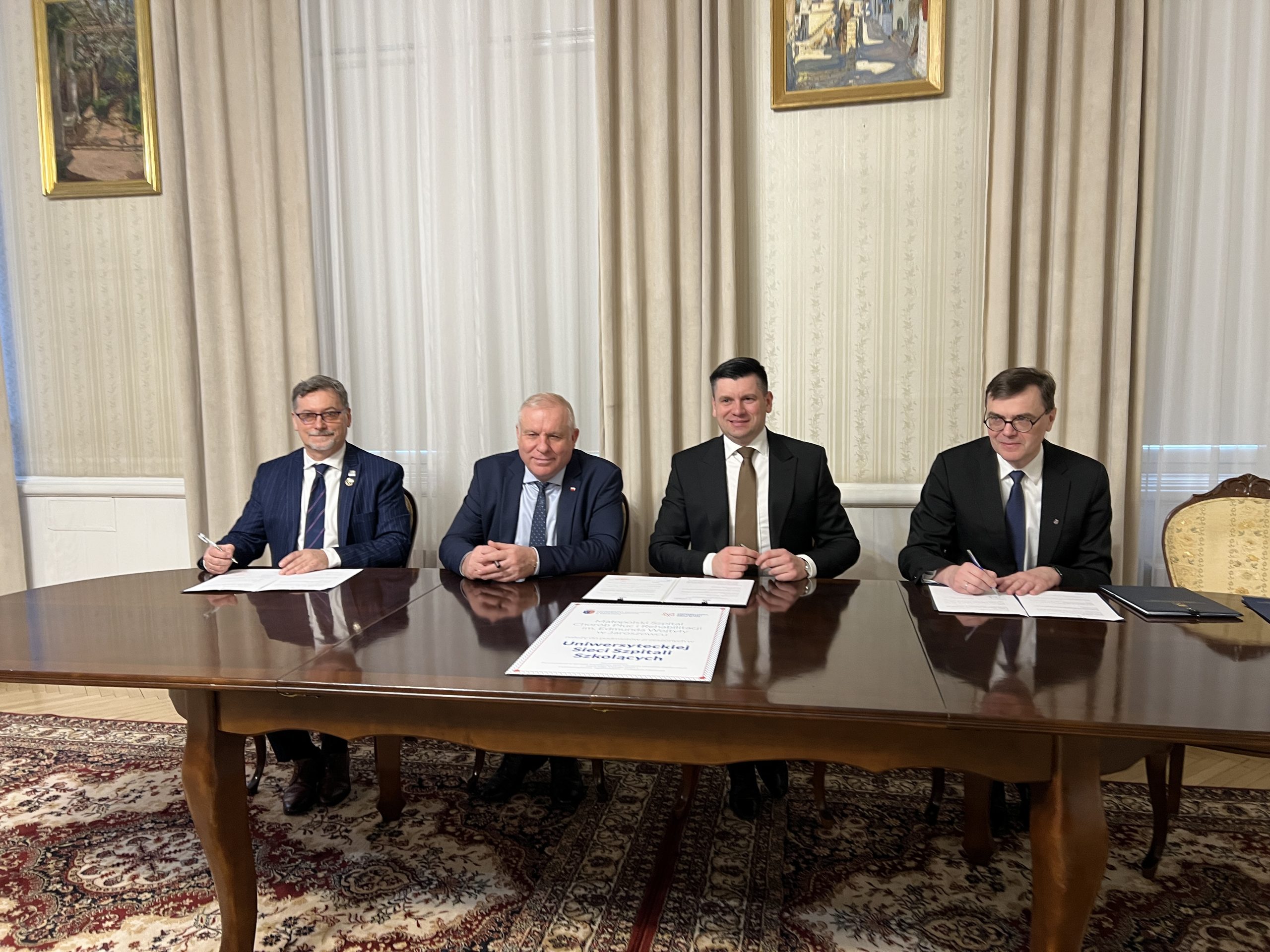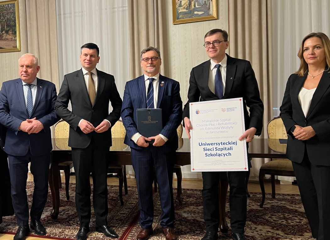 Podczas spotkania podpisano również dokument potwierdzający włączenie Małopolskiego Szpitala Chorób Płuc i Rehabilitacji im. Edmunda Wojtyły w Jaroszowcu, reprezentowanego przez dyrektora Krzysztofa Grzesika, do grona podmiotów zrzeszonych w Uniwersyteckiej Sieci Szpitali Szkolących.