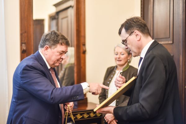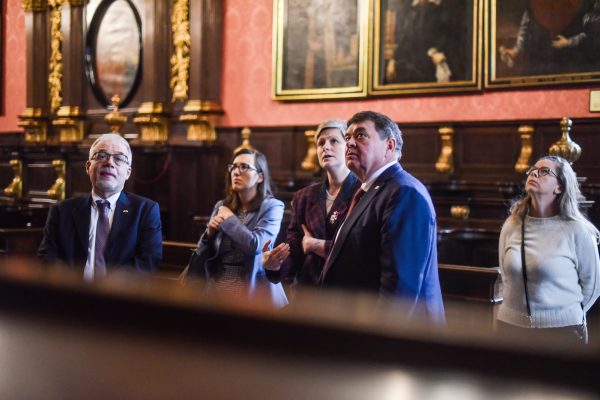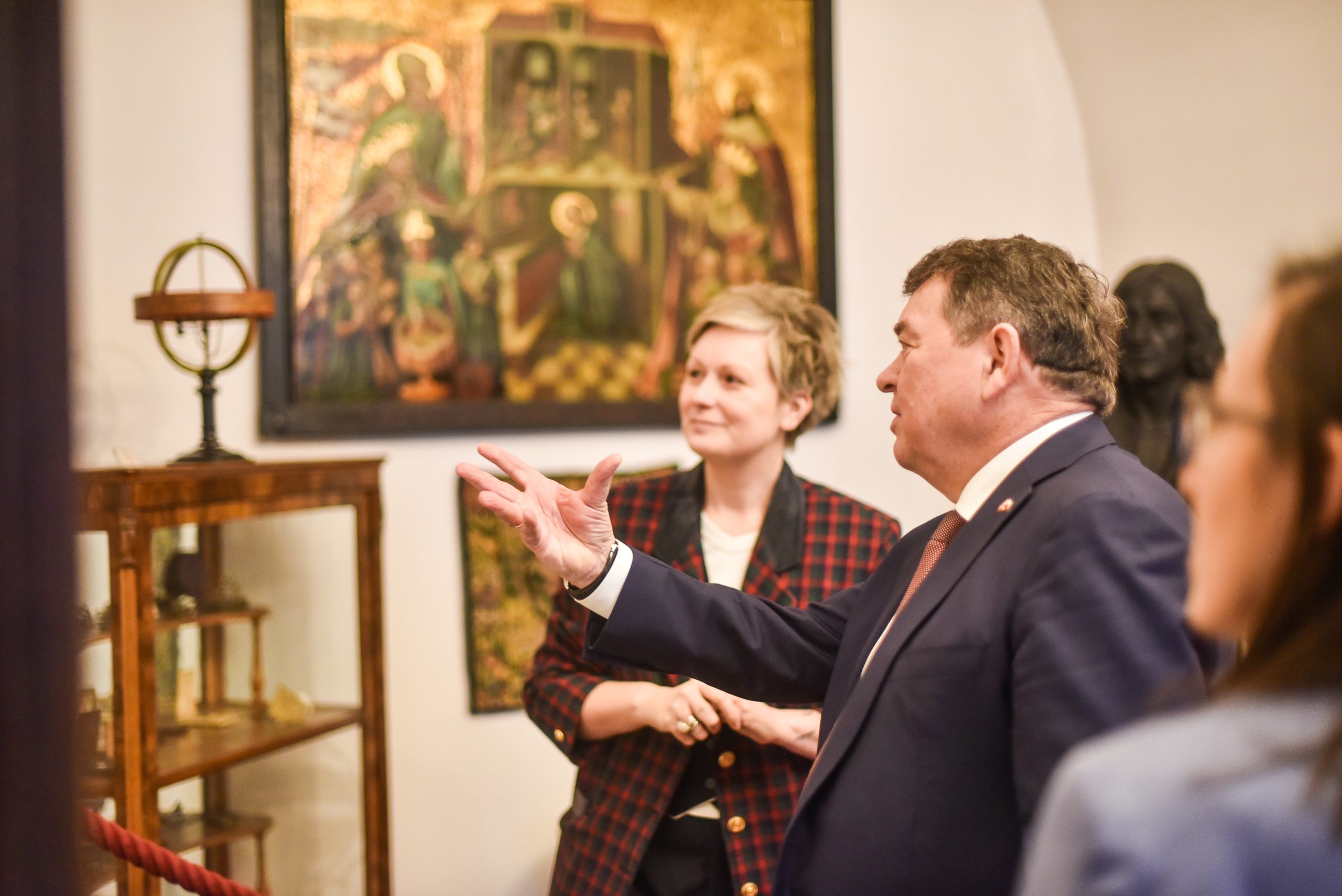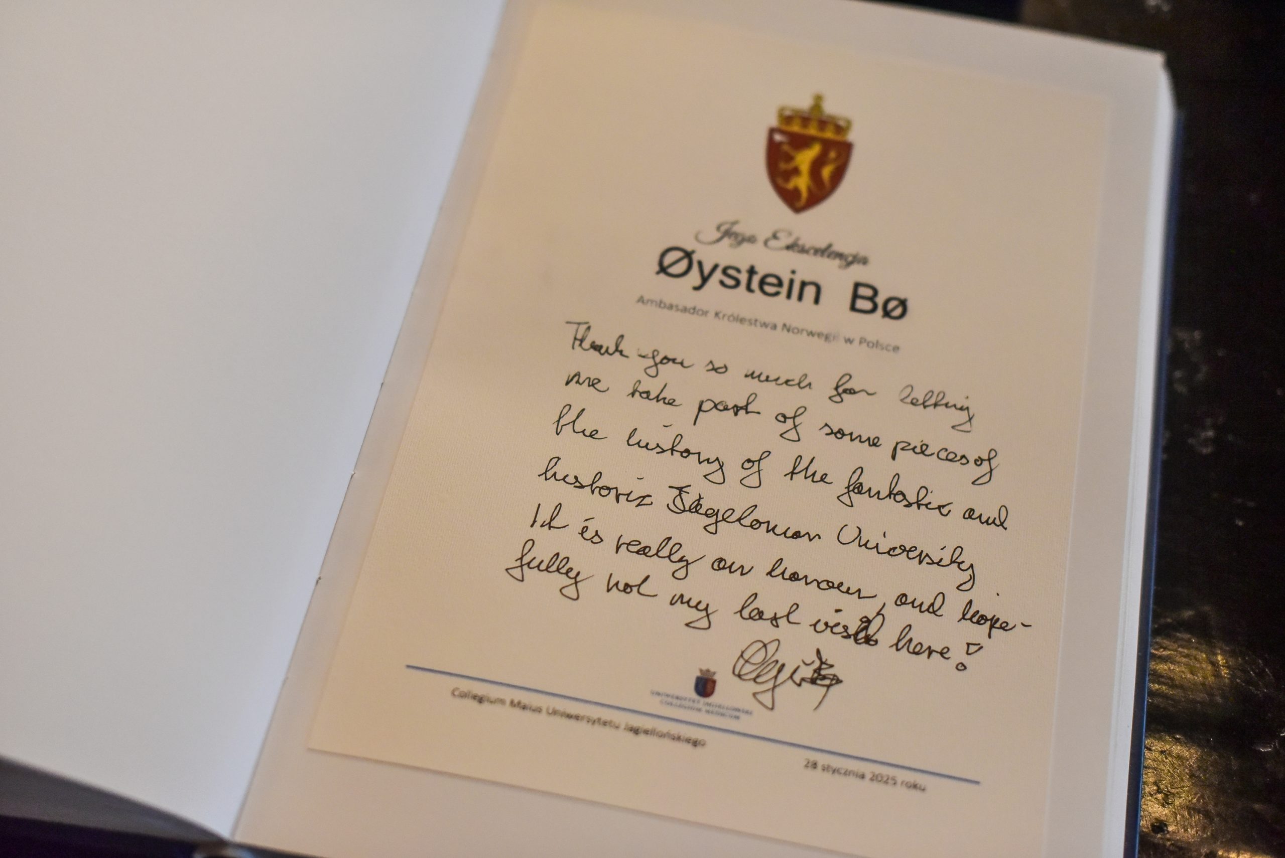 Delegacja norweska odwiedziła także Collegium Maius, gdzie znajduje się Muzeum UJ, w którym JE ambasador dokonał pamiątkowego wpisu do księgi gości.